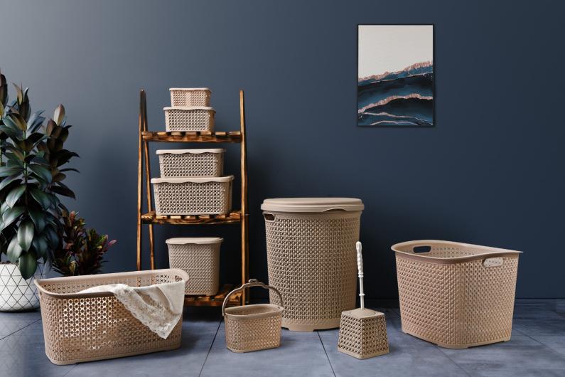 Our new beige color will bring happines to your house. .This collection consists of 16 pieces will help you to organize your stuff without trouble. Laundry baskets , multipurpose boxes , wc brush ,shelves will create happines in its area and make you laugh.
