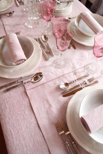 Burraco linen tablecloth and matching table runner with a handmade hemstitch.