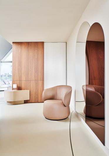 Sanfte biomorphe Formen, ein Design, das Komfort symbolisiert und weiche Polsterung – diese Merkmale verbinden sich zu einem Archetyp von Komfort, Wärme und offenen Armen. Das skulpturale Design arbeitet mit der Tektonik der Formen und schafft ein Sitzmöbel für den Innenbereich, das sowohl optisch ansprechend als auch ein angenehmes Sitzgefühl vermittelt. Die Form des Sockels unterstreicht auf harmonische Weise die natürlichen Bewegungen der sitzenden Person und das Motiv der Weichheit.