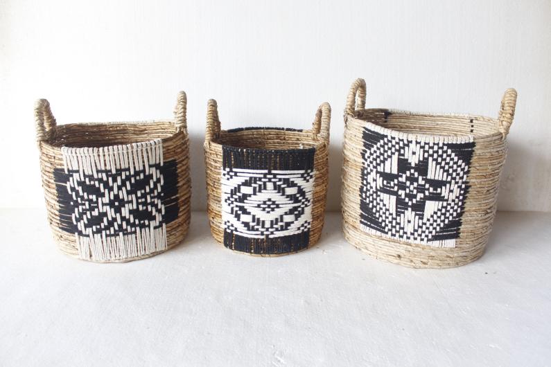 Diese geometrischen Stickkörbe sind dennoch schön und multifunktional als Spielzeugaufbewahrung, Buchaufbewahrung, Kissenaufbewahrung und andere. Hergestellt aus Bananenrinde und Baumwollseil.