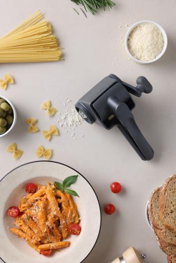 Die Zyliss Professional Käsereibe wurde entwickelt, um ein Restaurant-ähnliches Erlebnis in der Küche oder direkt am Tisch zu bieten. Die Edelstahltrommel ist mit scharfen, säuregeätzten Klingen ausgestattet, die mit minimalem Kraftaufwand harte Milch- und vegane Käsesorten, Schokolade sowie Nüsse mühelos reiben.