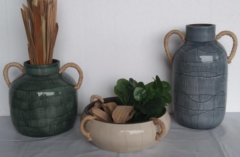 This collection includes a tall vase, short vase and a bowl with rope handles. Comes in Glossy Drippy Blue Green, Glossy Drippy Emeral Green and Glossy Drippy Cream finishes. The patterns add a delight to these beautiful vases and bowl.