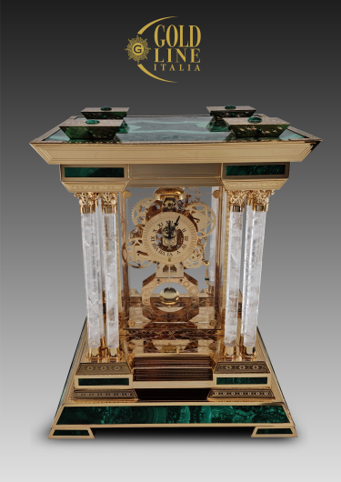 TALENT AND PRECISION OF OUR CRAFTSMAN ARTISTS COMBINED WITH THE SPECIAL MATERIALS HAVE MADE THIS LUXURY CLOCK AN AUTHENTIC MASTERPIECE. SOME PARTS OF THIS CHARMING PIECE ARE MADE IN GOLD PLATED BRASS, OTHER ELEMENTS ARE REALIZED IN GOLD PLATED STERLING SILVER. THIS LUXURY CLOCK ARTWORK CONSISTS OF 12 COLUMNS MADE OF CRYSTAL ROCK, A BEAUTIFUL SEMI-PRECIOUS STONE. EACH COLUMN HAS A CAPITAL REALIZED IN GOLD PLATED STERLING SILVER. ON EACH CAPITAL 10 DIAMONS AND 18 RUBIES, FOR A TOTAL OF 336 PRECOIUS STONES ADDING TO THE WHOLE PIECE AN EXTRA TOUCH OF PRECIOUSNESS. THE BASES ARE IN PRECIOUS STONES LIKE MALACHITE. THE OUTCOME IS A UNIQUE WORK OF ART.