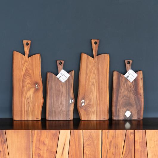 Schneidebretter aus Ulme oder massivem Nussbaumholz mit Silberguss, von unseren Handwerkern mit Leidenschaft und handwerklichem Geschick hergestellt. Die Schneidebretter werden direkt aus edlen Holzstämmen gefertigt, was garantiert, dass jedes Schneidebrett „nie wie das andere“ ist.