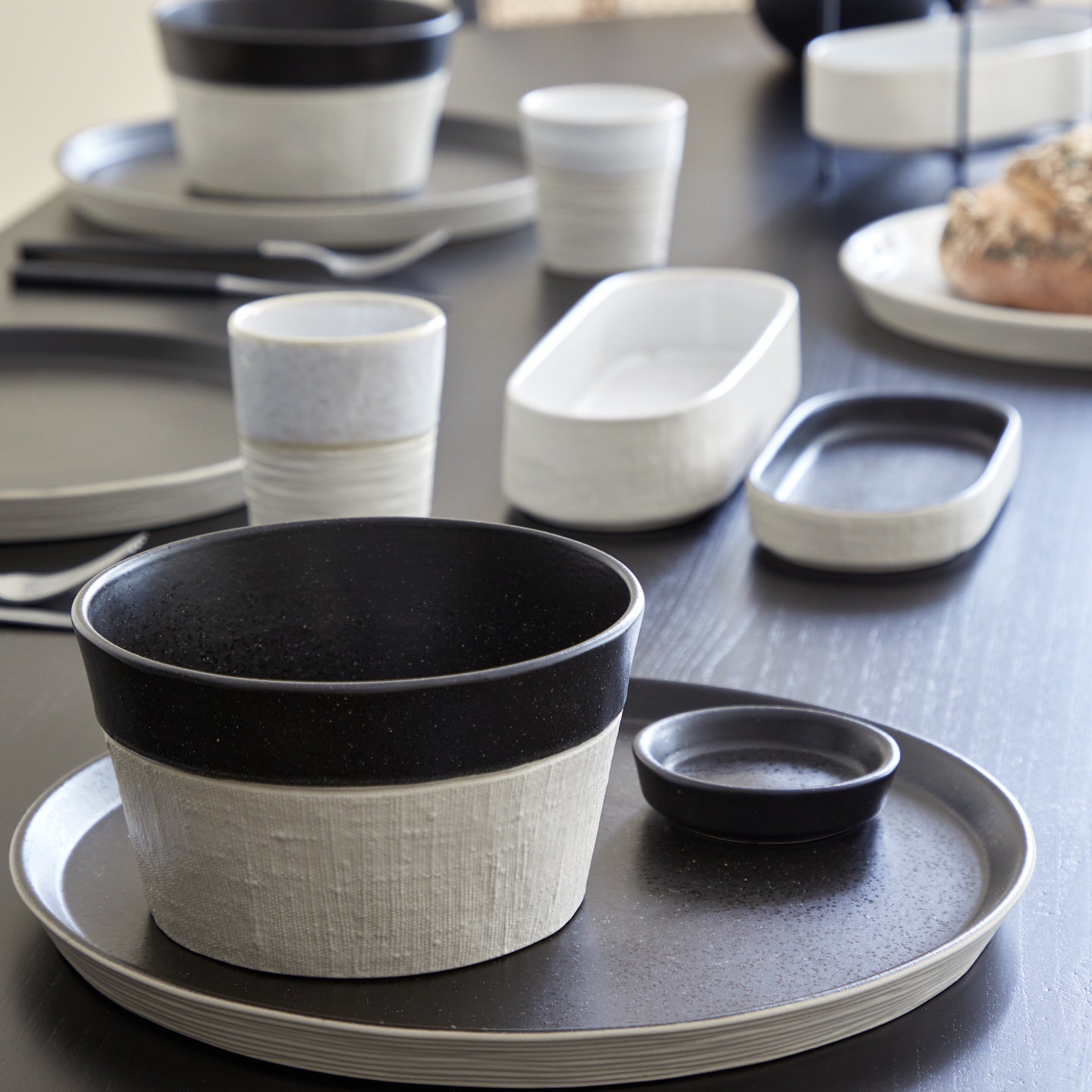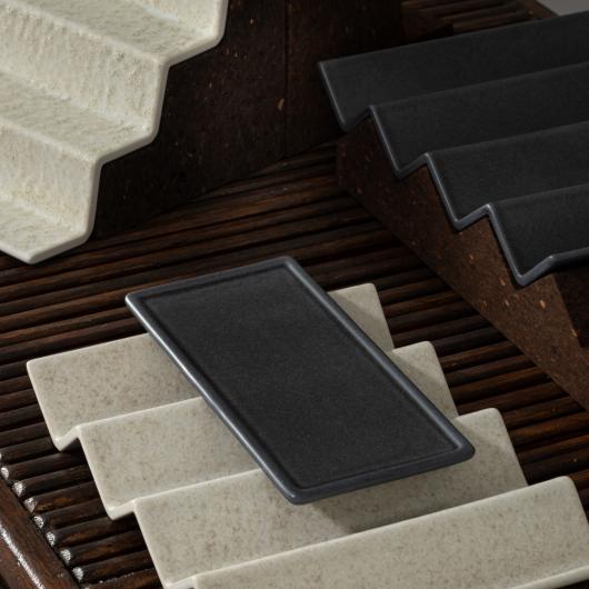 Eine Korktreppe bildet das Herzstück der Kollektion und ermöglicht das flexible Stapeln von Steinzeugelementen für innovative Präsentationen. Das Kippen und vertikale Positionieren dieser Elemente schafft beeindruckende Hintergründe und visuelle Tiefe.