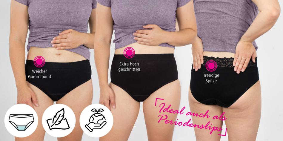 Auslaufschutz im Schrittbereich5-Lagen-Technologie: saugfähig und trotzdem diskret Hautfreundliche Baumwolle: 40°C waschbarPositiv für die Umwelt: weniger Einwegprodukte