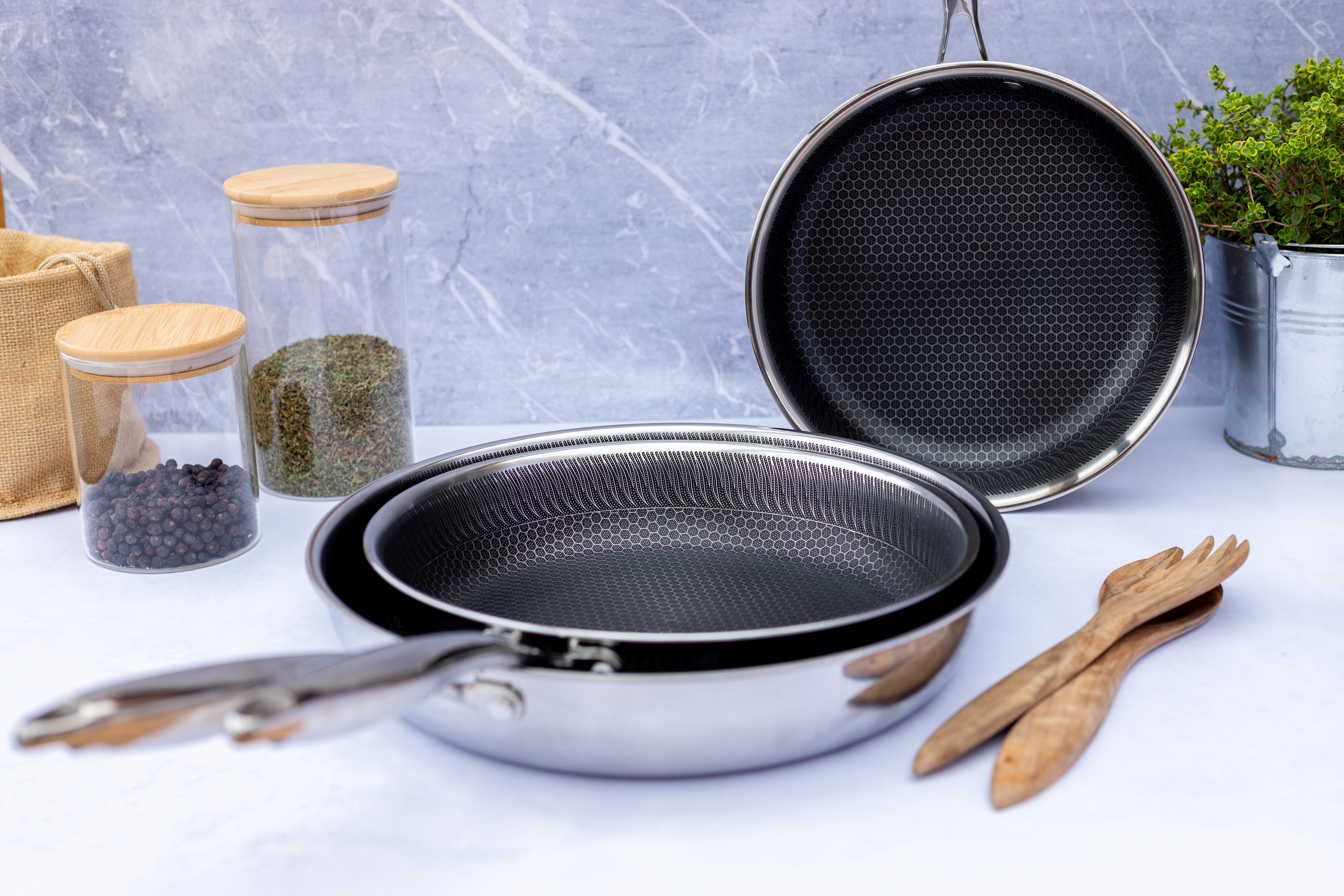 Gesund und fettarm Braten ohne auf die lecker krossen Röstaromen zu verzichten – das geht jetzt ganz einfach mit der Serie Hestia. Die Edelstahl-Pfannenserie der österreichischen Marke Mäser erfüllt die Erwartungen all jener Hobbyköche, die Fleisch und Gemüse scharf anbraten wollen, ohne dass etwas anklebt. In den Pfannen wird über die Antihaftbeschichtung eine spezielle Edelstahl-Wabenstruktur gelegt, die auch die Optik bestimmt.