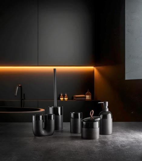 Der Seifenspender DEEP in Schwarz bringt eine elegante, moderne Note ins Badezimmer und kombiniert puristisches Design mit praktischer Alltagstauglichkeit. Der zylindrische Körper mit kuppelförmigem Abschluss und langem, geradem Auslauf wirkt klar und zeitlos, während die Bi Color Oberfläche aus mattem und glänzendem Schwarz dem Accessoire eine hochwertige Ausstrahlung verleiht und sich flexibel in verschiedene Einrichtungsstile integriert. Mit einem Fassungsvermögen von ca. 350 ml bietet der Spender ausreichend Platz für Flüssigseife oder Lotion und unterstützt eine aufgeräumte Optik am Waschbecken. Die Keramik sorgt für eine wertige Haptik, liegt angenehm in der Hand und steht stabil. Dank der möglichen Reinigung von Hand bleibt der Seifenspender hygienisch und gepflegt im täglichen Gebrauch.