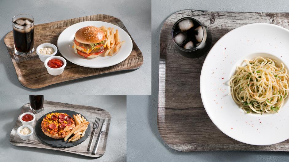 The matte surface and natural patterns, top-bottom covers, a feel wood effect at DECO Tray. It is ideal to use at high traffic self-service, canteen and fast foods service for long time use.