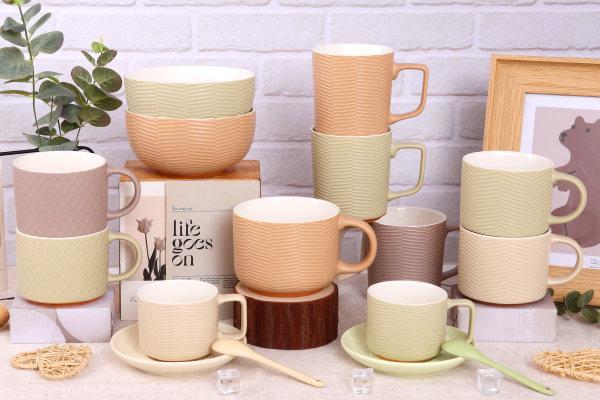Ceramic Embossed Matt Color Glaze Set, This product set employs various relief carving techniques and is decorated with a two-tone glaze. The edges of the pieces are also depicted using a slip glaze, featuring the most popular color combinations of the moment. This set is suitable for everyday use as well as for displaying on dining tables or in living rooms as decorative pieces.