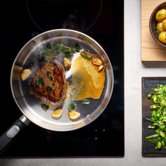 Edelstahlpfannen der Logic-Steel-Serie werden nicht nur besonders schnell heiß, sondern erhitzen sich durch die innenliegende Aluminiumschicht auch besonders gleichmäßig. Sag tschüss zu kalten Stellen in Deiner Pfanne! Egal, ob Du Fleisch oder Gemüse scharf anbraten oder gar flambieren und eine intensive Sauce zubereiten möchtest – diese Pfanne gerät nicht leicht ins Schwitzen. Hohe Temperaturen sind für sie kein Problem, und selbst im Backofen fühlt sie sich bei bis zu 300 ° C (ohne Stiel) pudelwohl.