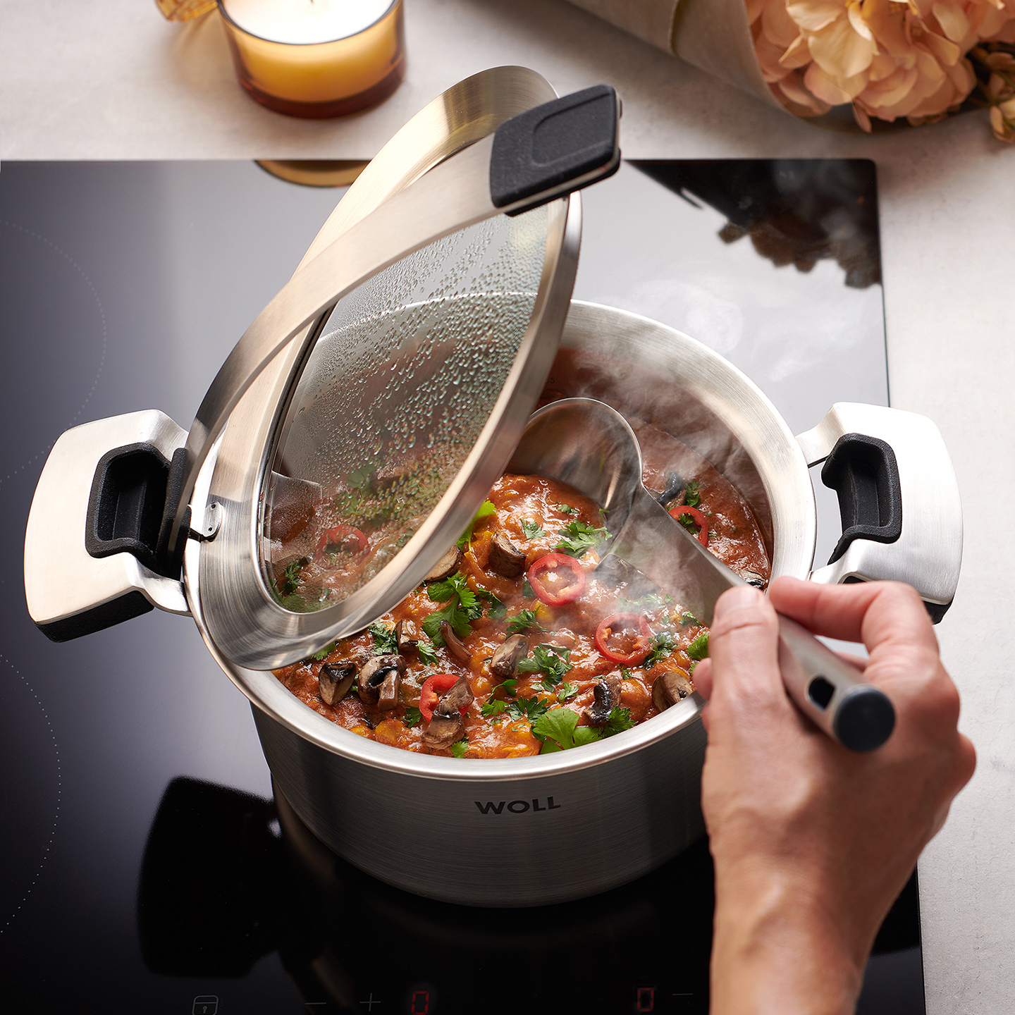 Ein Deckel ist gut zum Erhitzen, Garen und Dämpfen. Er lässt Dich energieeffizient und mit vitaminschonenden Temperaturen kochen. Aber wir finden, dass er noch mehr können sollte. Zum Beispiel verschiedene Positionen einzunehmen: mit leicht angehobenem Deckel kochen Pasta und Kartoffeln einfach am besten und können sogar ohne Sieb abgegossen werden. Und wenn er eingerastet auf dem Deckelrand steht, damit du Zutaten in den Topf füllen kannst, läuft das Kondenswasser schön sauber wieder in den Topf zurück – ohne Deine Arbeitsplatte unter Wasser zu setzen. In allem ein bisschen intelligenter sein – das ist typisch WOLL.
