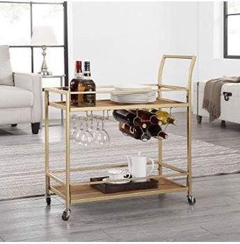 - this Gold bar cart is a versatile piece with a metal frame and faux wood shelves, with racks on the second tier that can hold up to 6 wine glasses and 5 compartments for wine bottle storage. The top is open to allow you to set drinks and snacks on top, and it comes with 4 metal wheels for easy maneuvering.