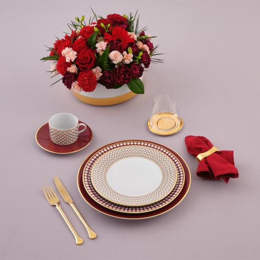 Ruby collection by Porcel was designed to shine at the table, transforming every moment into a celebration of refinement. Inspired by the world of precious stones — universal symbols of elegance — Ruby brings the distinction of the earth's noblest materials to everyday life. The geometry of its design, combining gold and deep burgundy on fine porcelain, creates unique reflections, evoking the faceted brilliance of a cut gemstone.