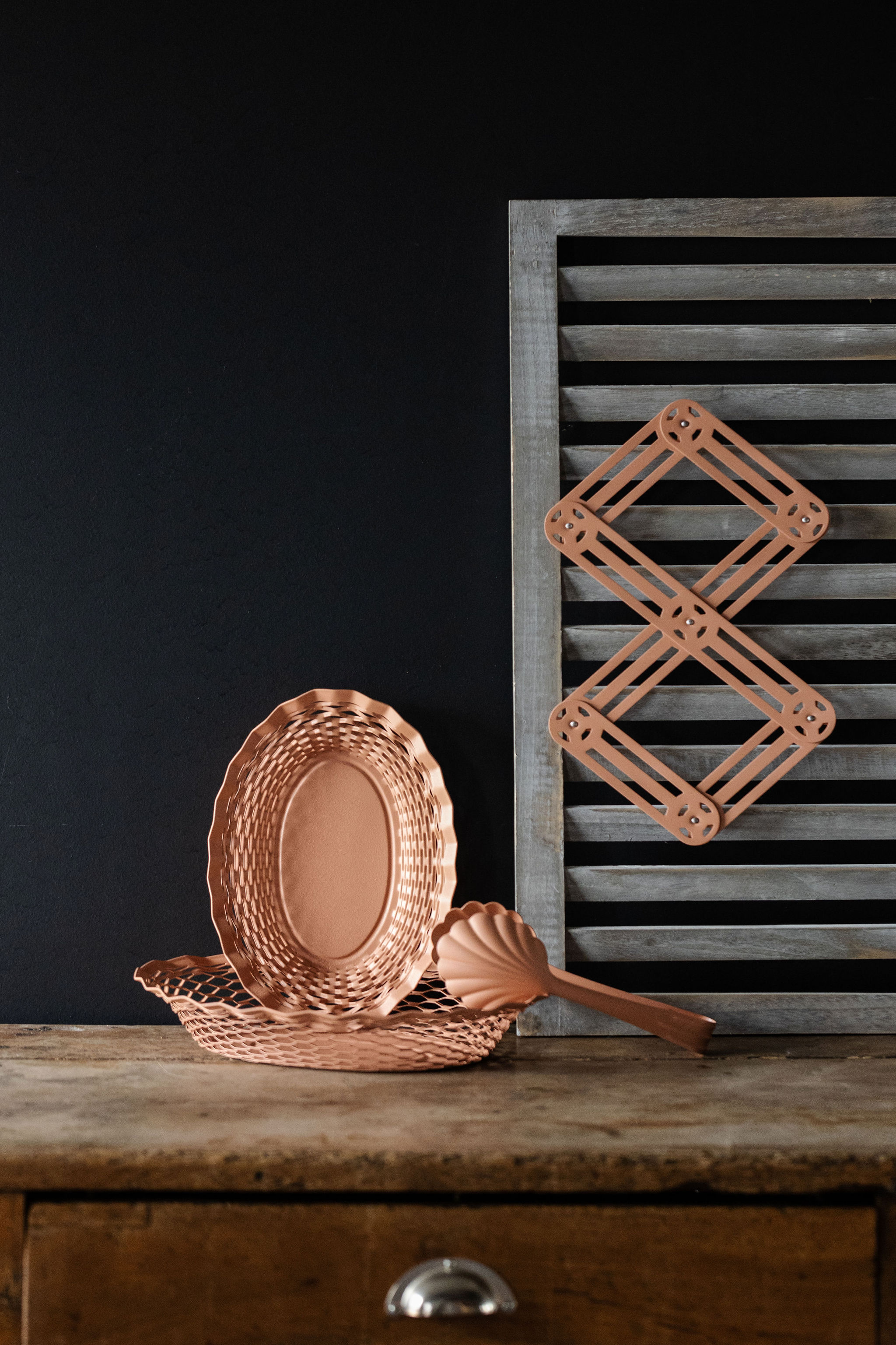 Brotkörbe, Untersetzer und Zangen in verschiedenen Farben.