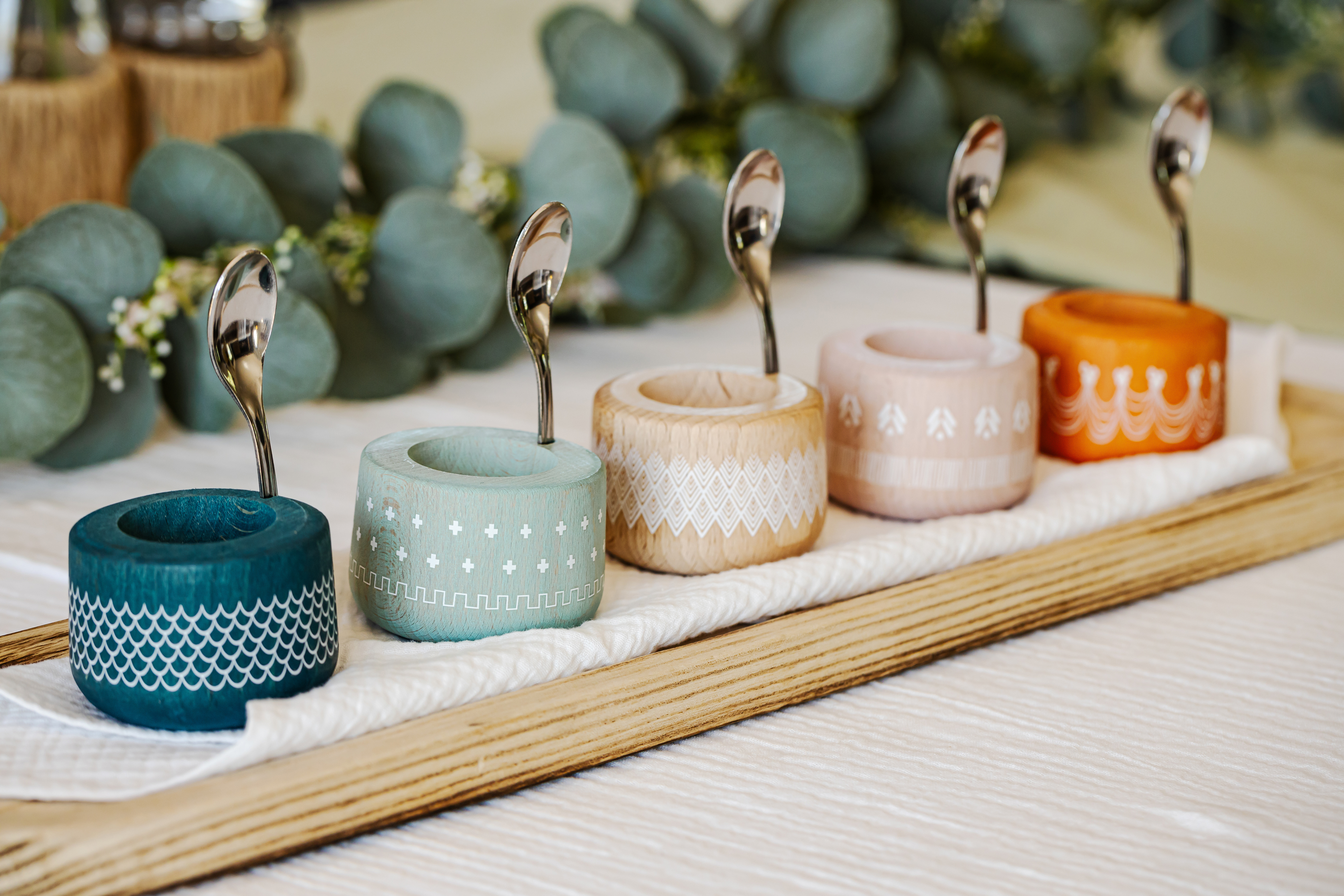 Eierbecher aus Holz in schönem Design und verschiedenen Farben, inklusive Löffel.