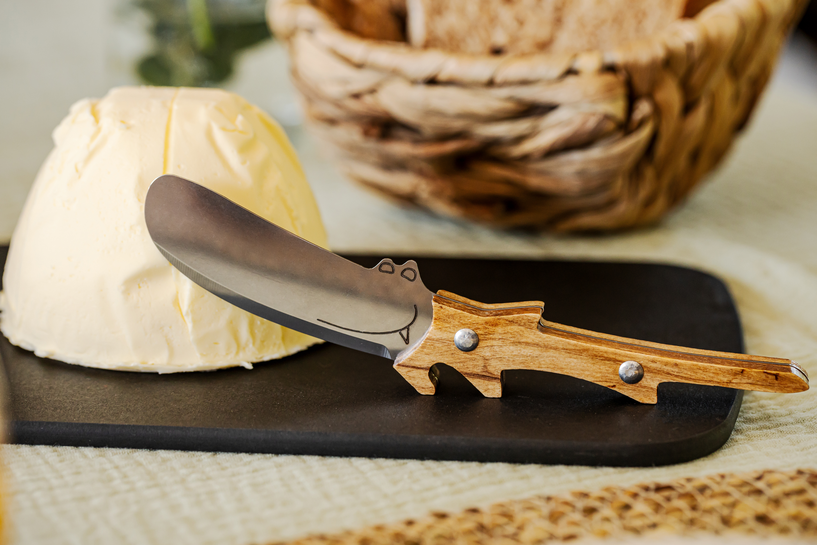 Brotmesser mit Olivenholzgriff in niedlicher Krokodil-Form.