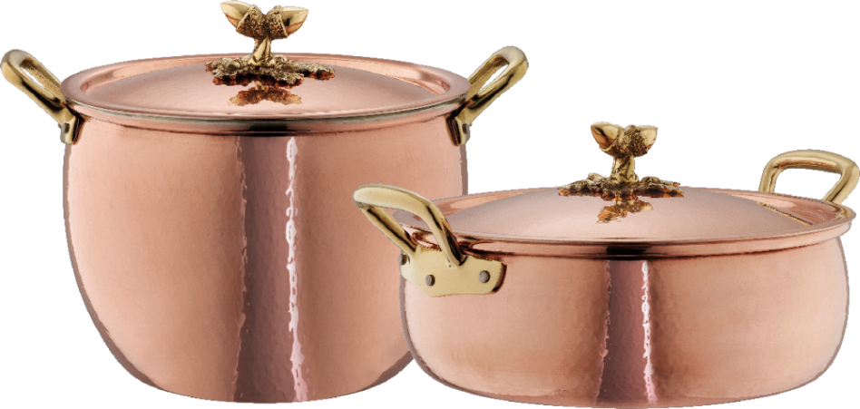 Suggested for cooking on the gas stove or in the oven, they manufactured in solid copper of 1,0 to1,5 mm thickness. The handles are made of hand-cast brass, and so are the sculpted acorns decorating the lid’s handle, that add a crowning touch to the unique quality of the piece.