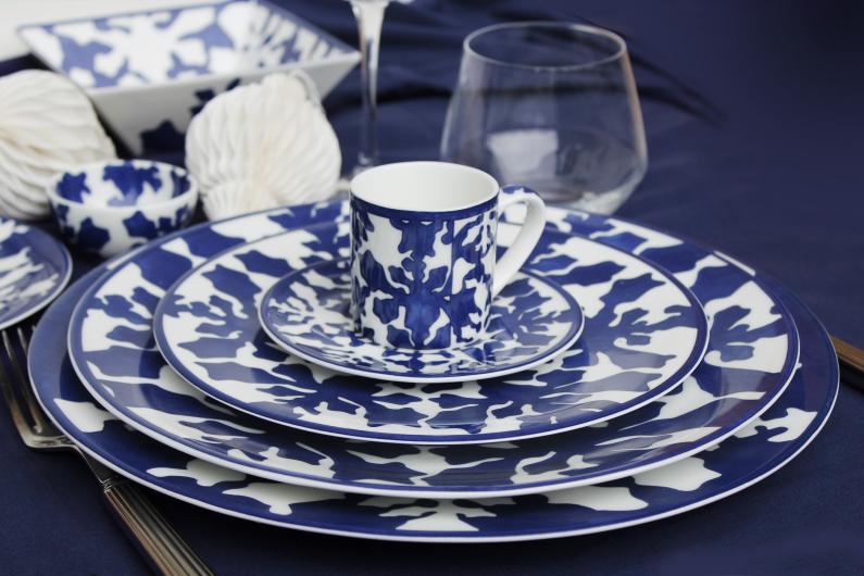 Elegant and contemporary, IMAGINE Collection, made in Luxury Fine Bone, is the first TAITÙ blue Collection: a natural and abstract world where everyone can freely imagine the forms that most express their own personality. The artistic approach originates from the uniqueness of Nature and from the geometries of natural elements (like snowflakes and seaweed). INNOVATION is the characteristic feature of IMAGINE Collection: a “game” from realistic to abstract drawing, the combination between positive and negative, and the proposal of “out of scheme” placements, like for the dinner and coupe soup plates.