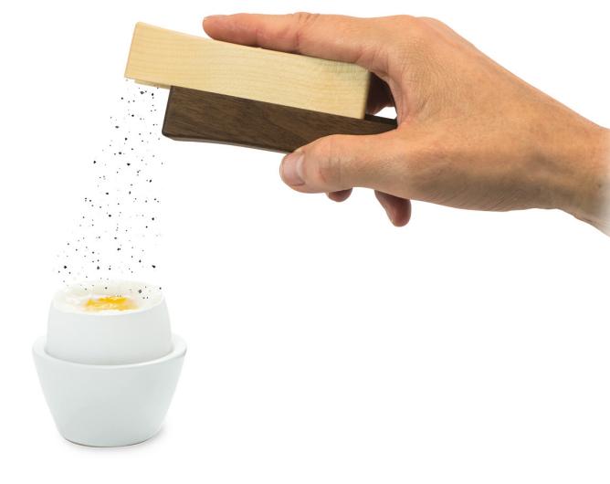 Ganz einfach lassen sich die beiden Hälften des „2Slide“ entlang der Längsachse gegeneinander verschieben, bis sie am Magnet stoppen und die Öffnung für Salz oder Pfeffer frei geben. Schräg halten und das Streugut herausrieseln lassen.