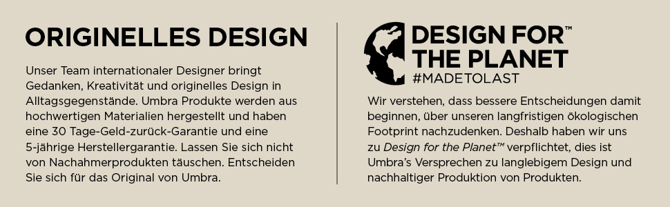 Umbra wurde aus Leidenschaft für originelles Design und dem Wunsch geboren, Produkte für jedes Zuhause zu schaffen. Bei Umbra bringt unser Team aus internationalen Designern Gedanken und Kreativität in die Alltagsgegenstände. Angetrieben von Innovation lassen wir uns vom globalen Markt inspirieren, um die Grenzen unseres Ansatzes für originelles Design zu erweitern.