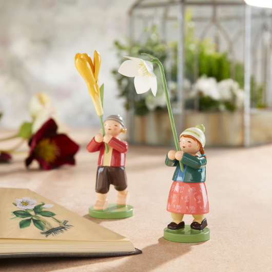 Die ersten Blumenkinder entstanden im Jahr 1929. Grete Wendt nahm bei deren Gestaltung jenes Thema auf, das den Inhalt ihres Schaffens bestimmte: die Sehnsucht nach Güte und Geborgenheit. Mit ihren großen farbenfrohen Blumen führt jede Figur dahin zurück.