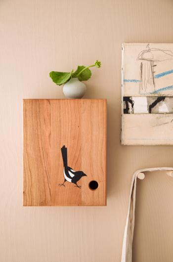 Das detailreiche Design dieses Schlüsselschranks aus Kirschholz ist von der Natur inspiriert. Auf der Tür befindet sich eine neugierige Elster in Kerbschnitt, die durch ein Loch späht, das als Türgriff dient. Der Schrank hat ein traditionelles Leinöl-Finish, das die Messingscharniere hervorhebt. Das Kirschholz reift mit der Zeit und bekommt einen warmen, rötlichen Farbton. Die schöne Maserung weist dunklere Akzente auf, die durch Harztaschen entstehen. Der Vogel in Kerbschnitt auf der Tür ist mit wasserbasierten Farben bemalt.