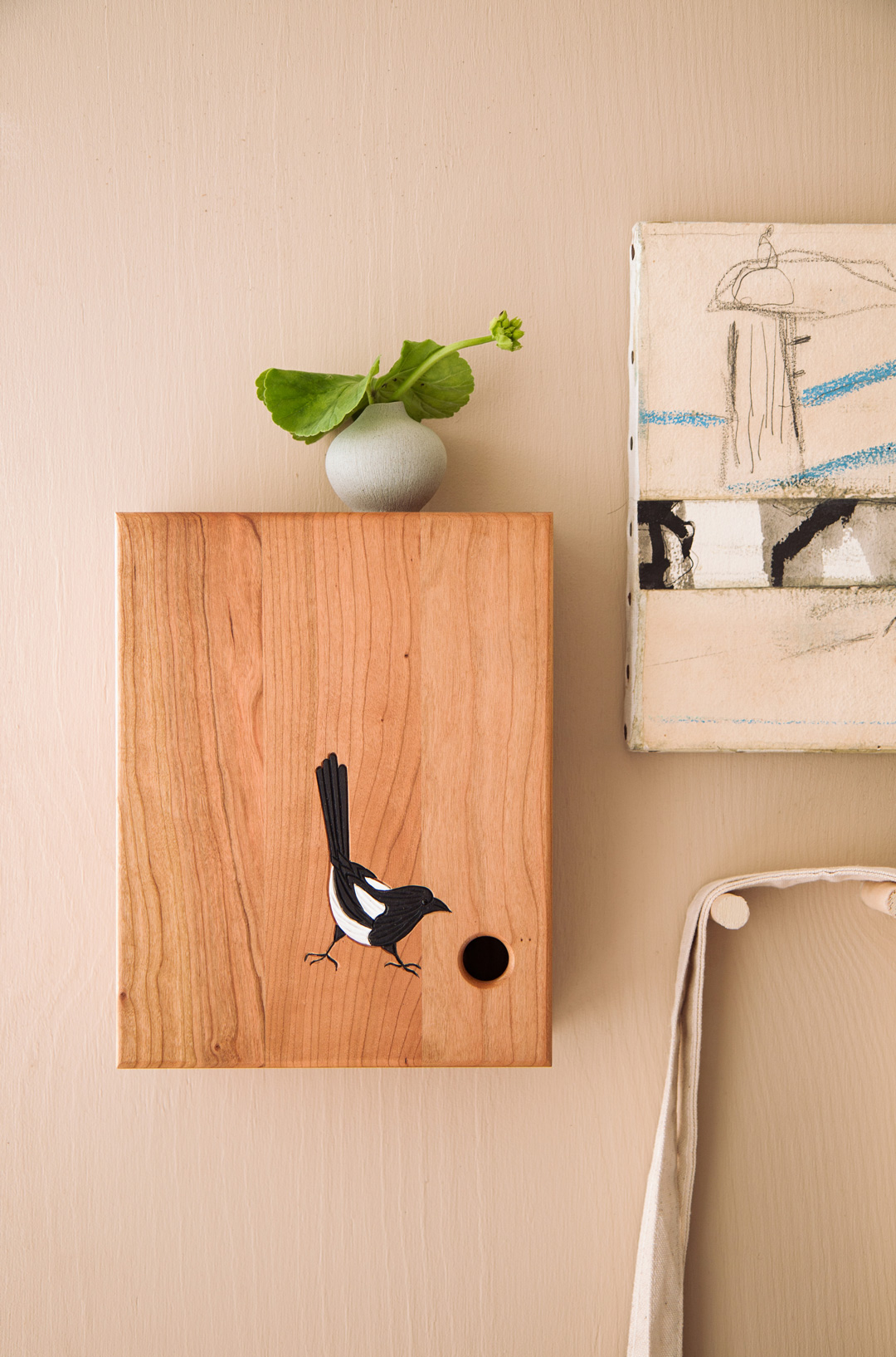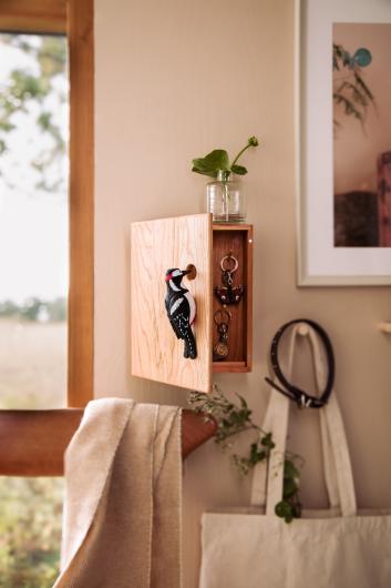 Das Design dieses Schlüsselschranks ist von der Natur inspiriert. Auf der Tür sitzt ein kunstvoll geschnitzter Holzvogel, der als Griff dient. Der Schrank hat ein traditionelles Leinöl-Finish, das die Messingscharniere hervorhebt. Das Kirschholz reift mit der Zeit und bekommt einen warmen, rötlichen Farbton. Die schöne Maserung weist dunklere Akzente auf, die durch Harztaschen entstehen. Die Vogelfigur ist von Hand mit wasserbasierten Farben bemalt.