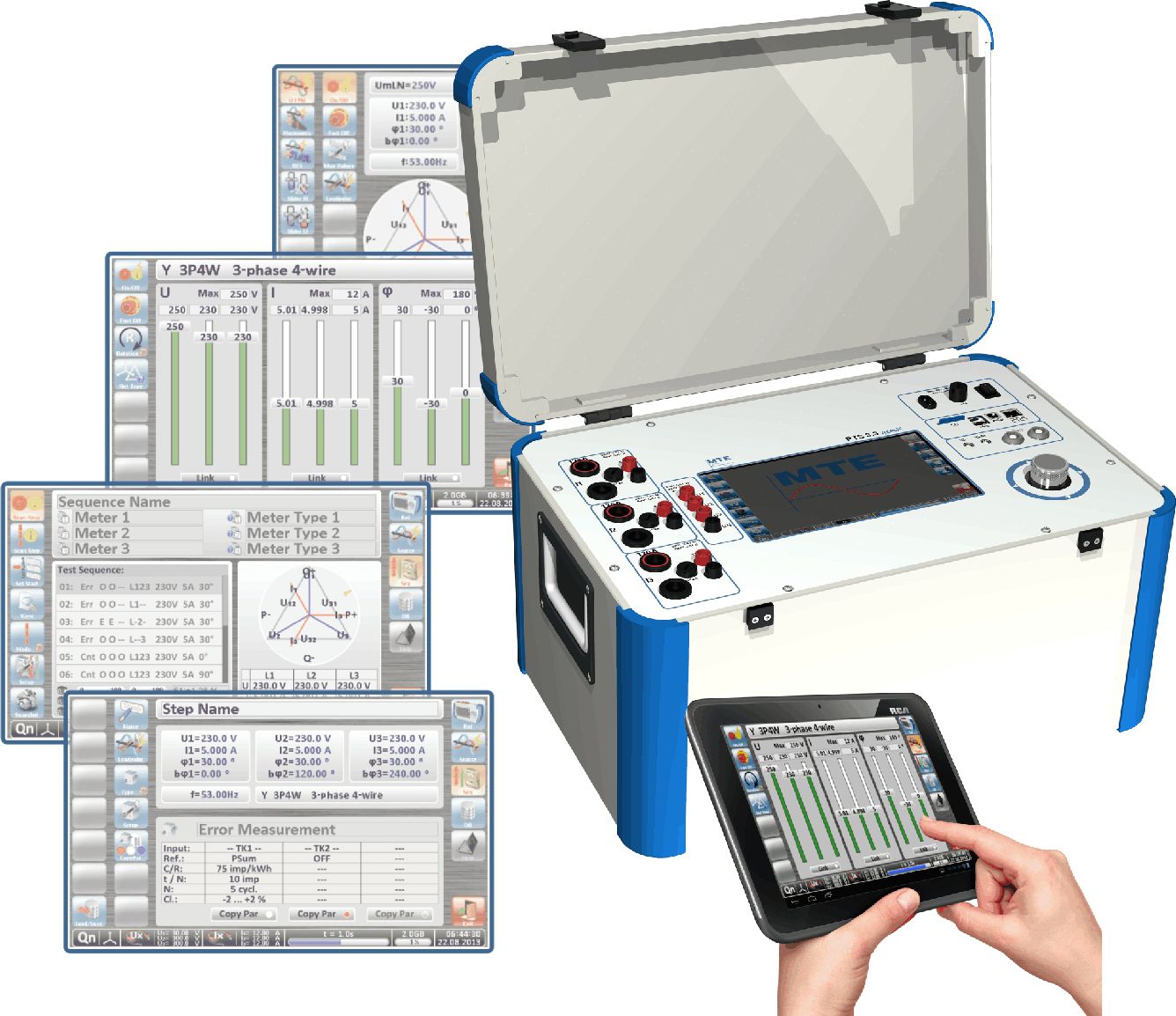 Equipo de ensayo trifásico con patrón de referencia clase 0,05 con fuente integrada de tensión, corriente y generador de armónicos