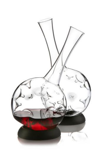 Das Volumen dieses Beatmungsgeräts wurde so dimensioniert, dass bei einer Befüllung von bis zu 1,5 Litern eine möglichst große Oberfläche des Weines entsteht. Der Dekanter steht aufgrund des abgeflachten Bodens sicher und gerade, eine optional erhältliche Basis aus mattschwarzem Silikon ermöglicht zudem auch eine schräge Positionierung.