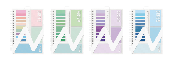 Soft sprial bindingSize:148X210mmPP (one side with diagonal texture, one side glossy)with silk screen printing and round cornerPost-it notes: 20 sheets white paper with 4C printingRuler: 85×170mm, 60C transparent frosted PP with black silk screen printing,and die-Cutting,with 10 rows of translucent PET removable sticky notes (20 sheets per row, size: 12×45mm)Inner:80 sheets white paper with 1C/1C printing