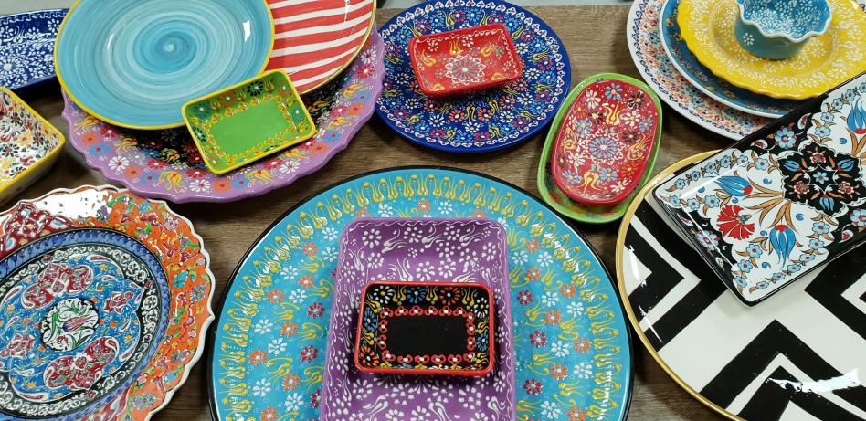 Ceramic plates & platters in variety of shapes & patterns.
