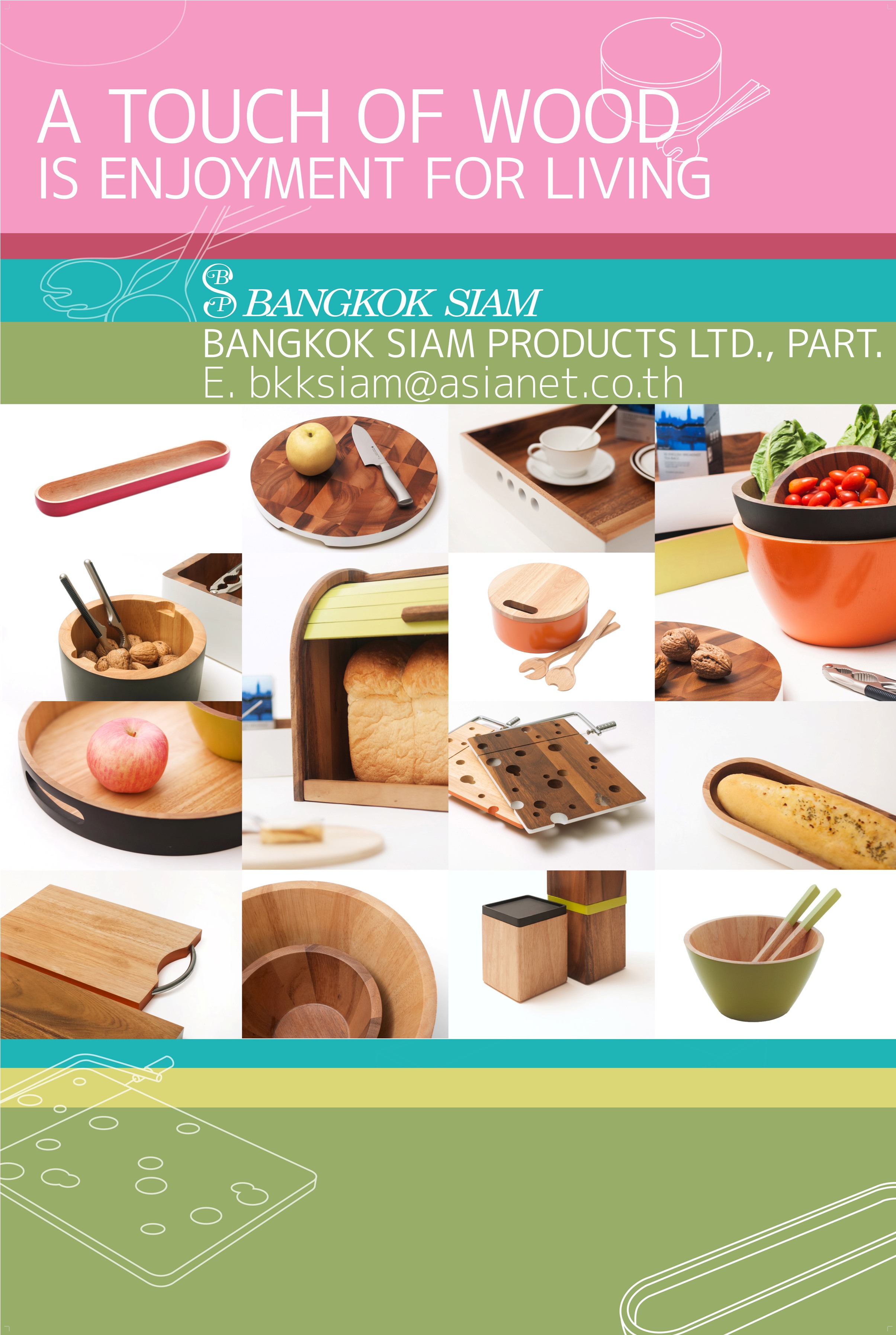 Since 1972, Bangkok Siam Products Ltd., Part. has been a leading manufacturer and exporter of high-quality wooden kitchenware and tableware. Specializing in durable Acacia and Rubberwood, we offer a diverse range of items including cutting boards, salad bowls, serving trays, coasters, trivets, and utensil boxes.