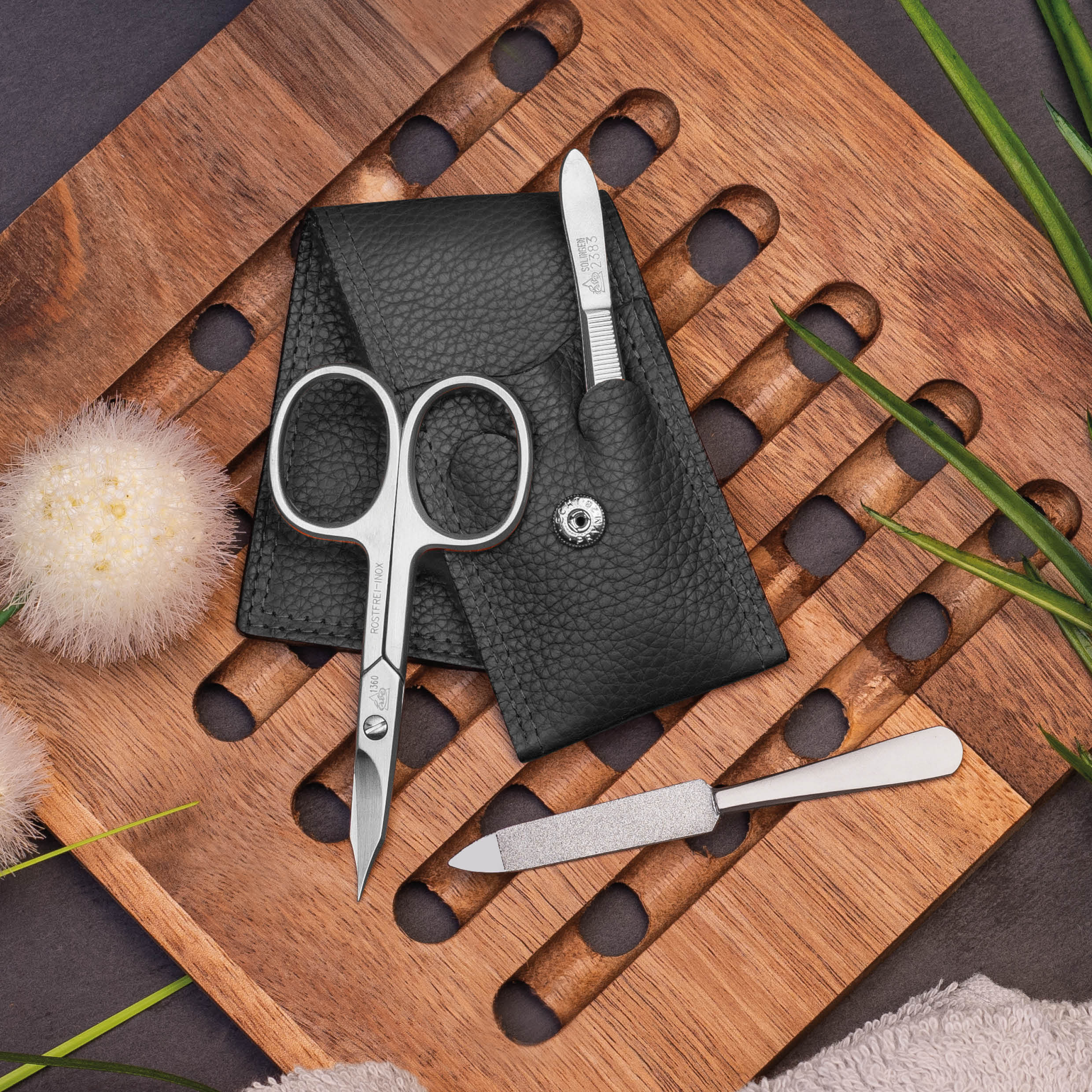 The functional, 3-piece nail care set in a genuine leather case with press stud fastener is particularly small and handy, but still offers the most important instruments for daily nail care.