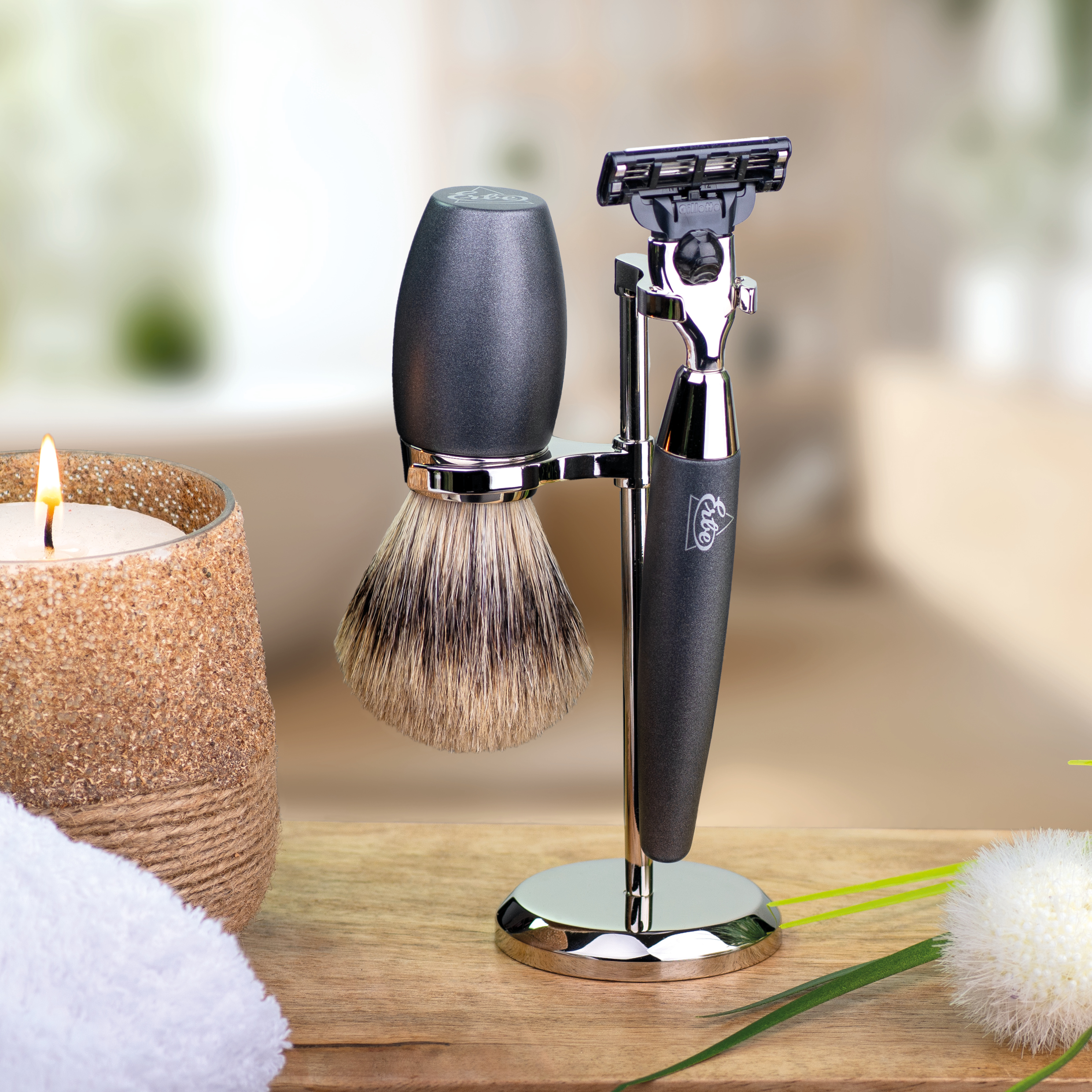 - Modern 3-piece shaving set with brush, razor and holder