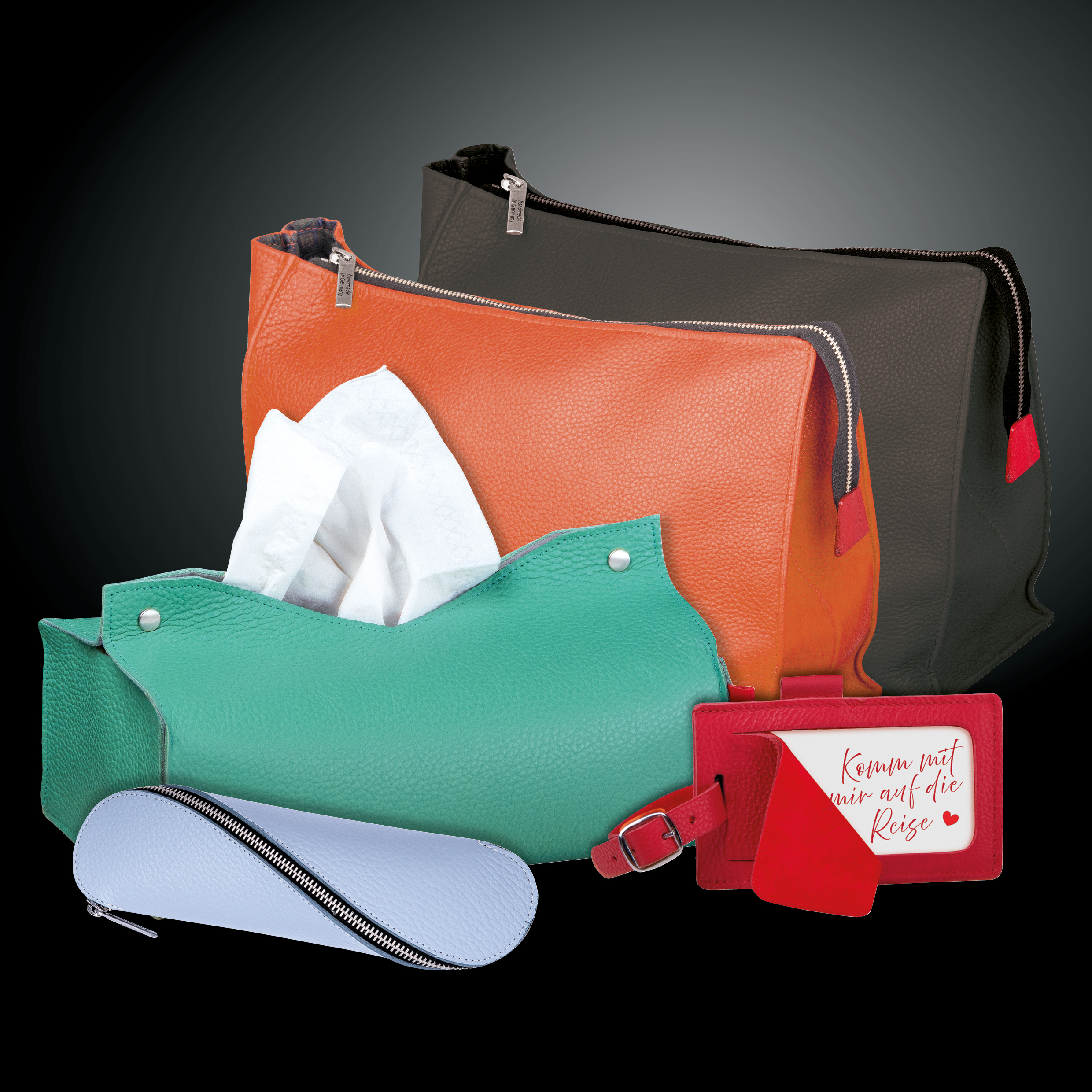 Hand-sewn cases, toiletry bags, cosmetic bags, luggage tags, key rings and much more.