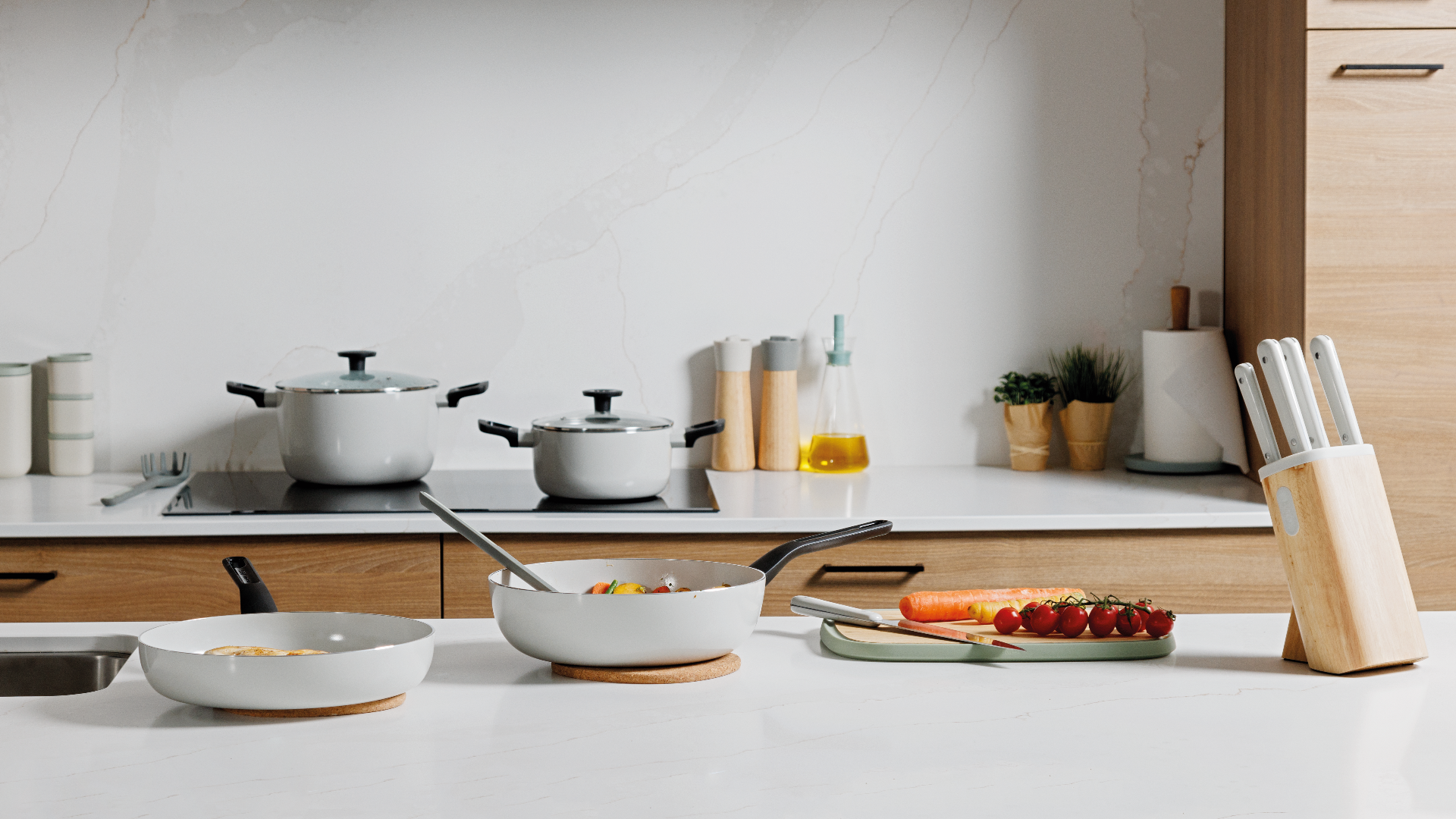 Examples are kitchen tools with double functions and jars made with recycled plastic that prevent food waste. The new Leo cookware is made with recycled materials, a healthy (PFAS-free) ceramic coating and is energy-efficient! Our product packaging is FSC-certified, 100% recyclable and contains no plastic laminations.