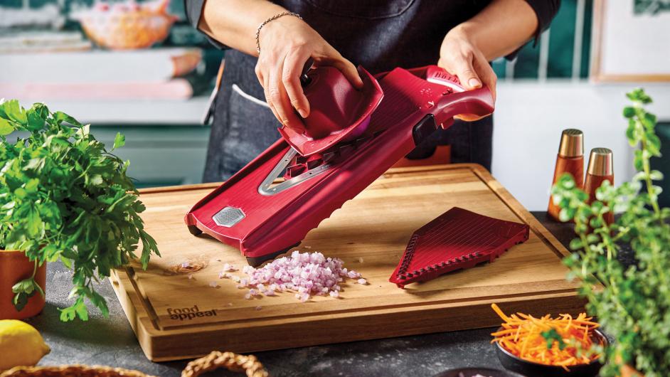 The V5 vegetable slicer can be used with four different inserts – slice insert, 3.5mm, 7mm and 10mm blade inserts. These offer the possibility to cut different sized slices, stripes and cubes. For quick processing of fruits and vegetables, as well as protection against the sharp blades, we recommend the use of the Food Safety Holder.