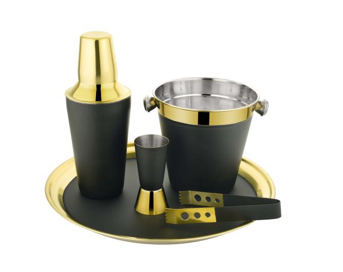 5pc Bar Set ideal for Gifting which includes Bar Tray, Ice Bucket with Tong, Cocktail Shaker & Peg Measure. This set can be customised with another options & different finishes.