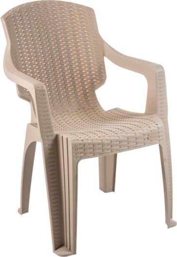 Elegant chair with rattan weave pattern, for long-term use. It is easy to clean, durable and resistant to the action of atmospheric factors and UV rays, recyclable. Dimensions: 55 cm x 62 cm x 84 cm. Available in white, beige, brown, gray or any other colour as per request. Recycable product.