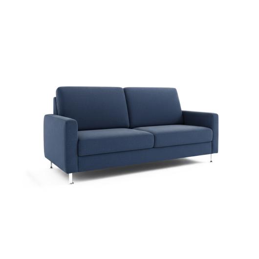 The sofa rests on delicate, high metal legs (chrome look), which give the piece a visual lightness—it almost seems to float in the room. This design choice offers a decisive practical advantage in daily operations: the high floor clearance allows for quick and thorough cleaning underneath the sofa, significantly facilitating the work of your housekeeping staff.