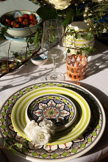 Azis is a design in a fresh green color combined with a bit of dark blue and black to make the green color stand out. This design is also a part of the Originals series. A set table with this design immediately gives a wonderful spring feeling. This design can easily be combined with the Breton series, and the design: Pistache.