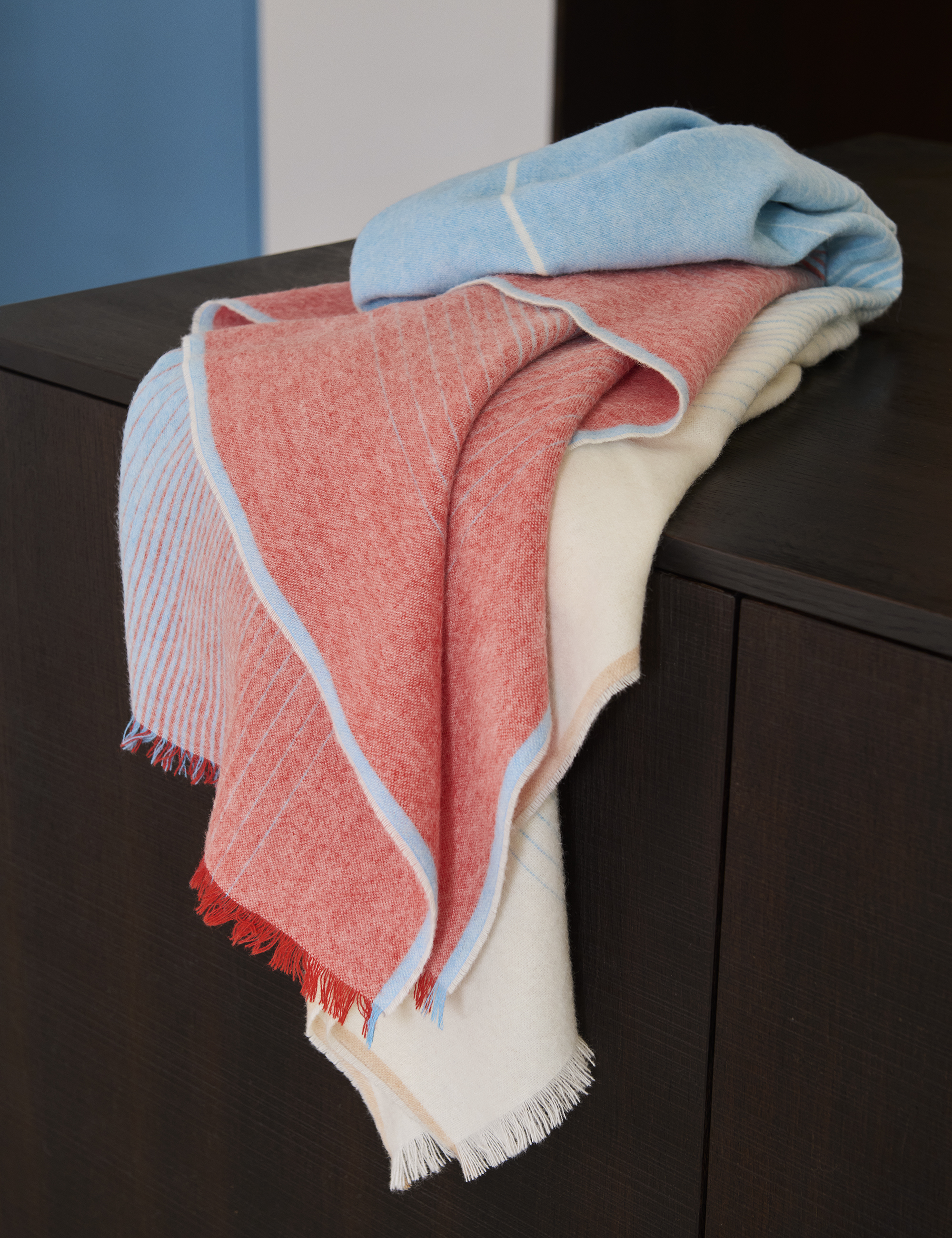The throw named Lava is bombastic and warm, just like the volcanic lava it is named after; one of nature's most fascinating phenomena. The material is a mix of soft alpaca wool with a small amount of nylon, but it's the yarn that gives the surface its special character. It's a bouclé type, characterised by small loops that give extra volume and create a characteristic fluffy surface that retains warmth without compromising on lightness. Lava is available in three beautiful versions with wide coloured stripes that meet on a warm cream background - a modern moss green and pink, an elegant blue-grey and brown, and the more classic navy and sky blue.