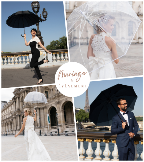We've chosen to offer you simple models to ensure a beautiful wedding with any type of outfit. What's more, this gives you the opportunity to decorate the umbrella to suit your needs. With our printing partner, you can customize a transparent umbrella (only available in black) in quantities of 50 or more. Finally, in terms of size, you're bound to find what you're looking for, with umbrellas for one or two (or even an extra guest of honor with the large golf umbrella).