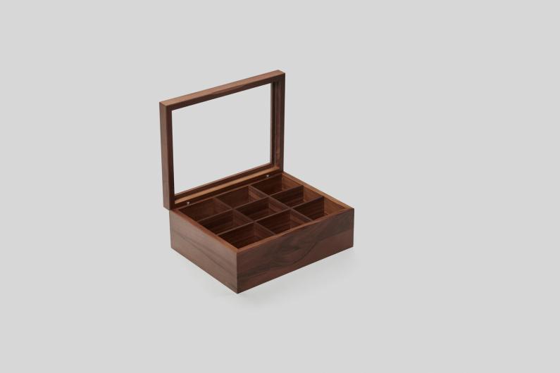 A traditional yet contemporary tea box with nine compartments made of walnut and finished with a fine matte lacquer. The transparent lid allows you to view the contents and ensure you’re not running low on your favourite brew. Chrome-plated hinges and an elegant grip for easy opening on the front side complete the premium teatime presentation.