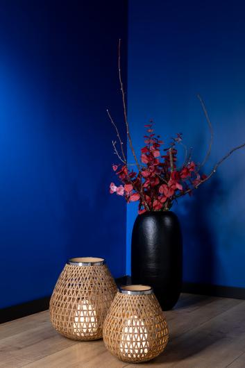 Soft shapes, gentle earth tones and subtle patterns are the basis for every cosy home. With their understated look, the SHONA hurricanes fit in perfectly and create a magically lighting mood after sunset with their sophisticated woven details. The shiny metal rim provides an expressive contrast to the natural look. The lanterns are available in two sizes, which are perfect for large pillar candles. Each individual piece is elaborately handcrafted using traditional methods, resulting in unique, one-of-a-kind items with their very own manufacturing history.