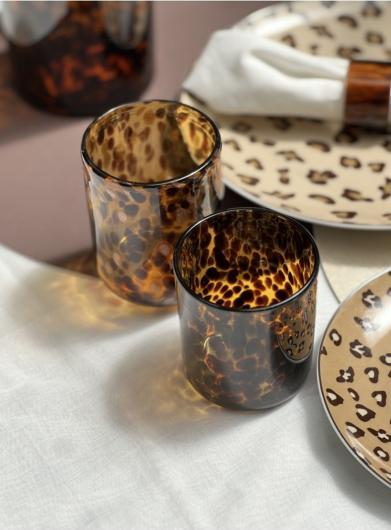 This season, we bring a bold twist to classic leopard-patterned glassware. Each piece is mouth-blown, featuring a random leopard motif that makes every item one of a kind. To enhance its charm, delicate gold glitter accents illuminate the warm transparent brown, adding a festive, sophisticated glow.