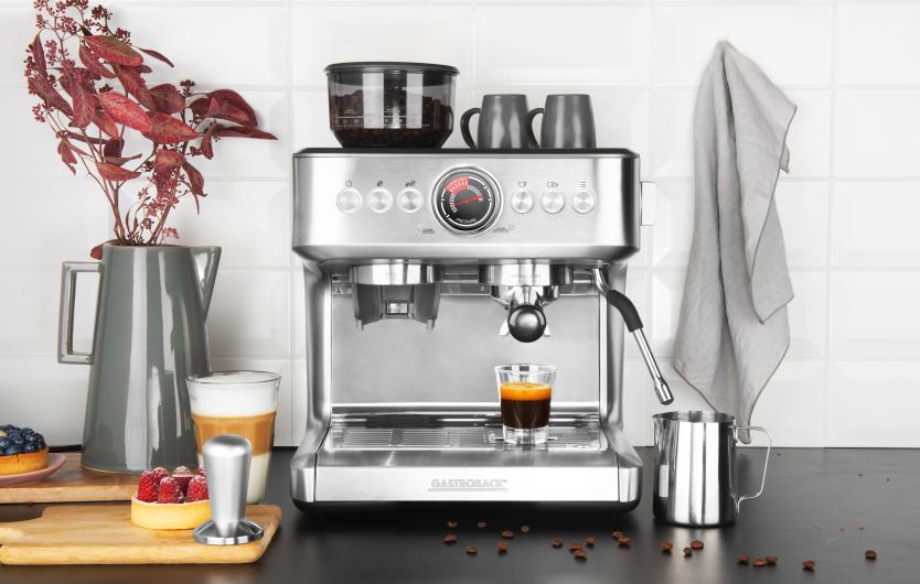 The GASTROBACK® Design Espresso Advanced Duo comes with a single-wall filter insert for 1 and 2 cups, a milk froth jug, cleaning tool and a professional espresso tamper made of stainless steel.