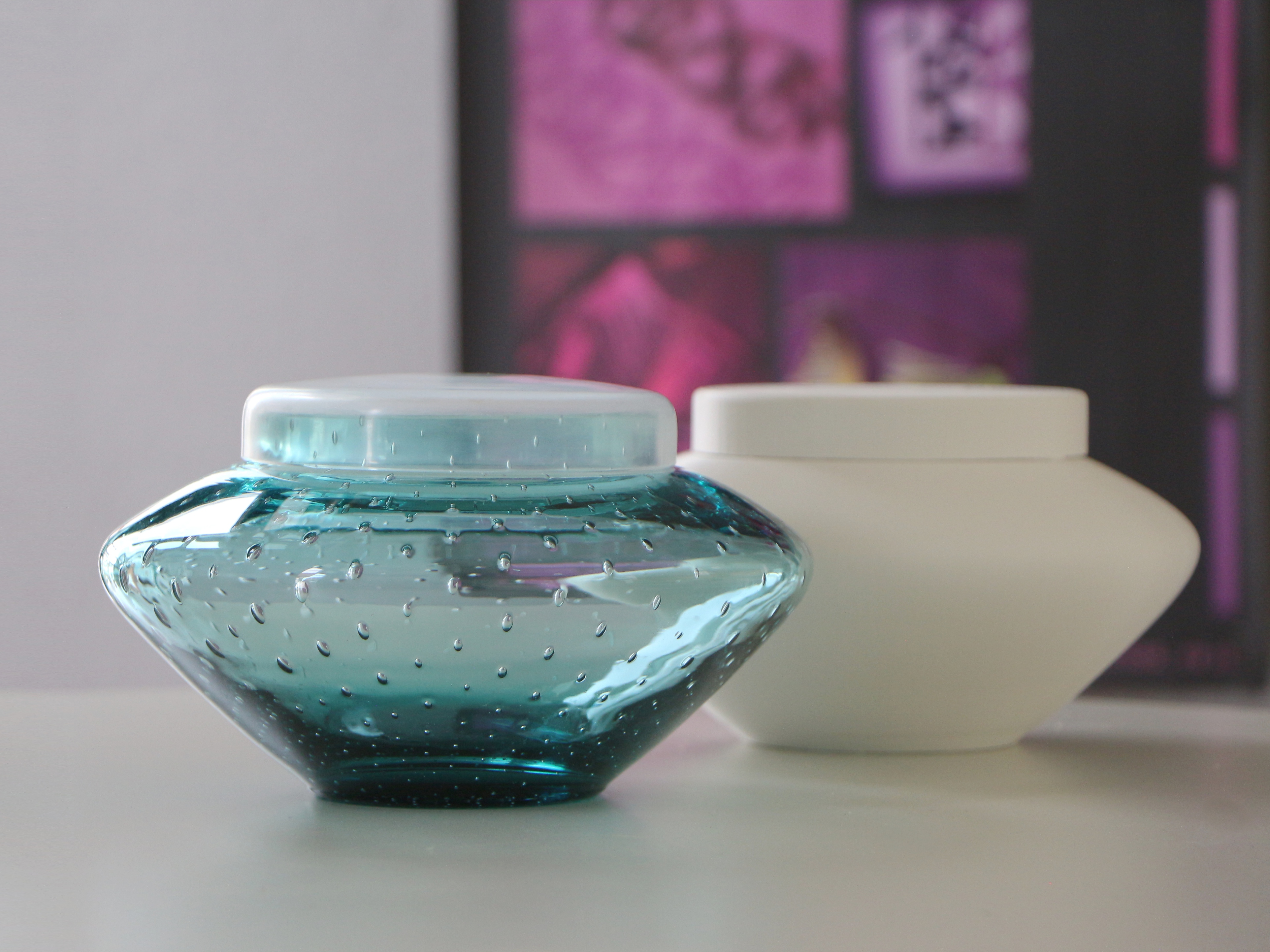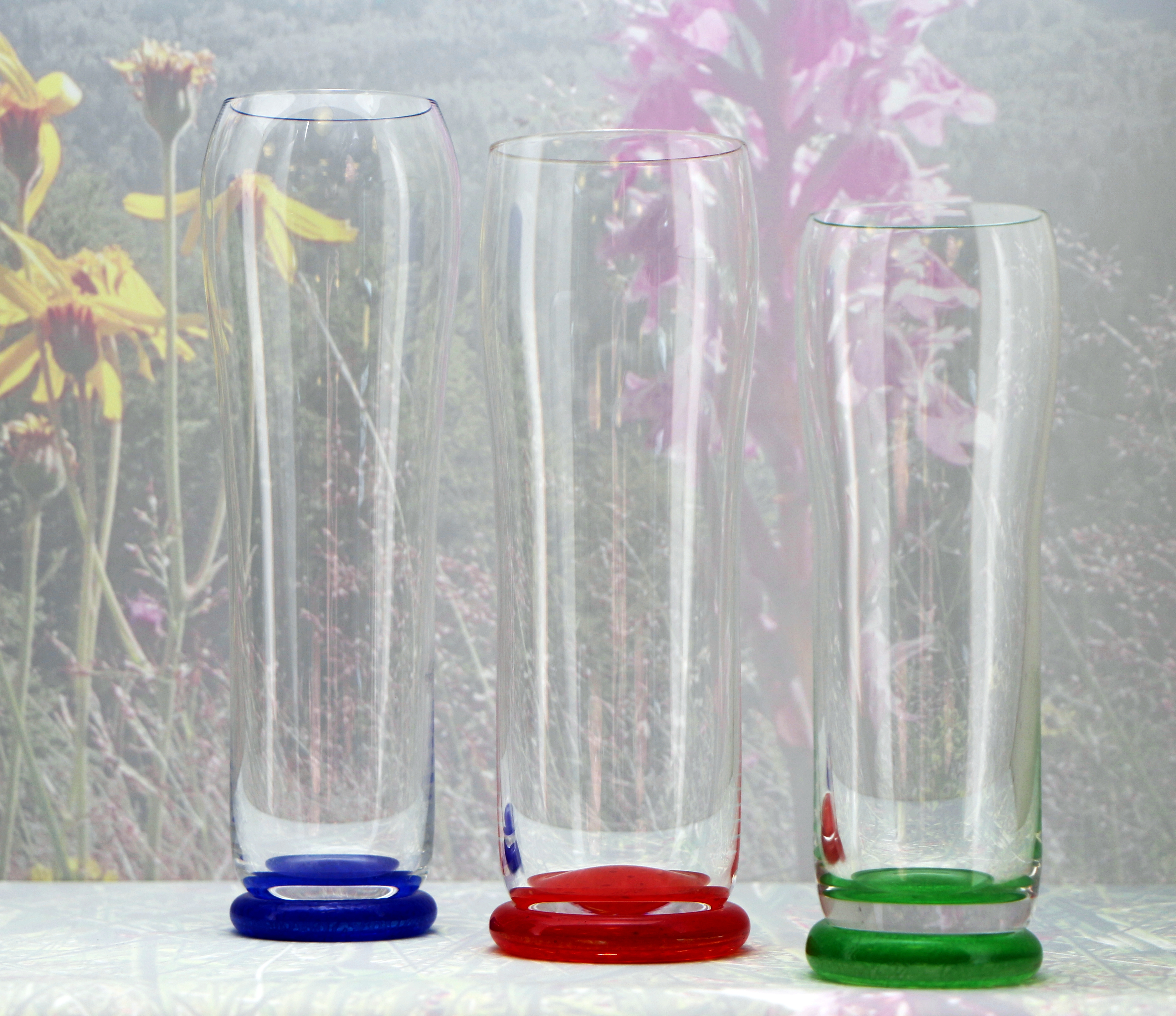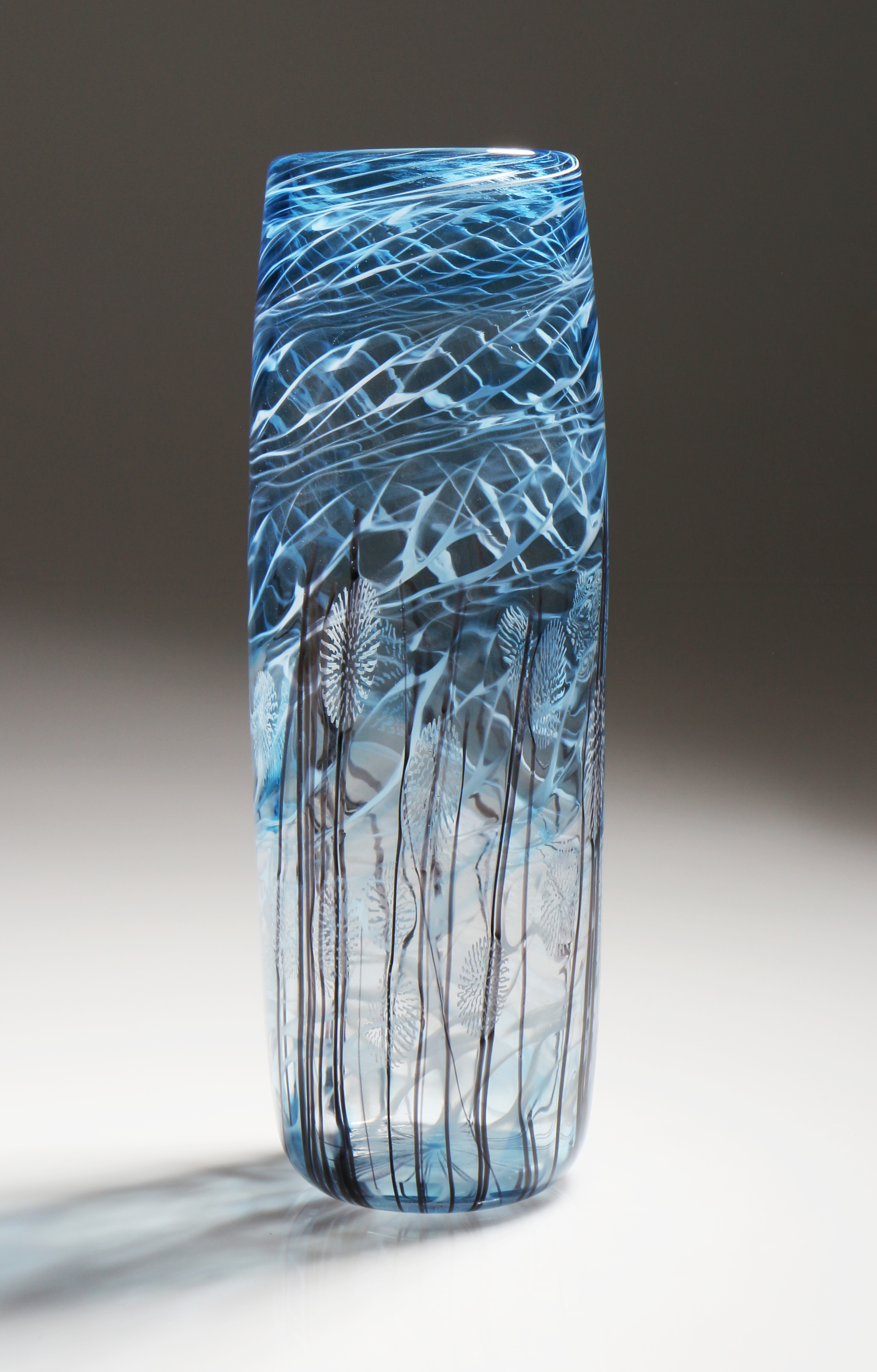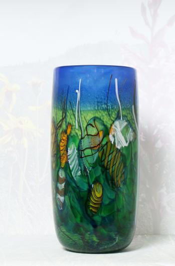 Vase, als sogenannter "Innenüberfang" gefertigt. Auf den Glasvorposten in Lapisblau und Sattgrün werden nach dem Überstechen charakteristische Elemente der "Blumenwiese" aufgenommen - Gräser in Form von lebendigen Grüntönen und azurblauen Glaskörnern, Halme als dünne Glasfäden und verschiedenste Blüten und Samenstände in Form von "Mascherln". Diese fußen auf venezianischen Herstellungstechniken, welche sich über Jahrhunderte im Böhmerwald weiterentwickelten. Nach dem erneuten Überfangen mit Kristallglas werden die formgebenden Schritte bis zum ausgearbeiteten Rand ausgeführt, der abschließend nach dem Umheften entsteht.