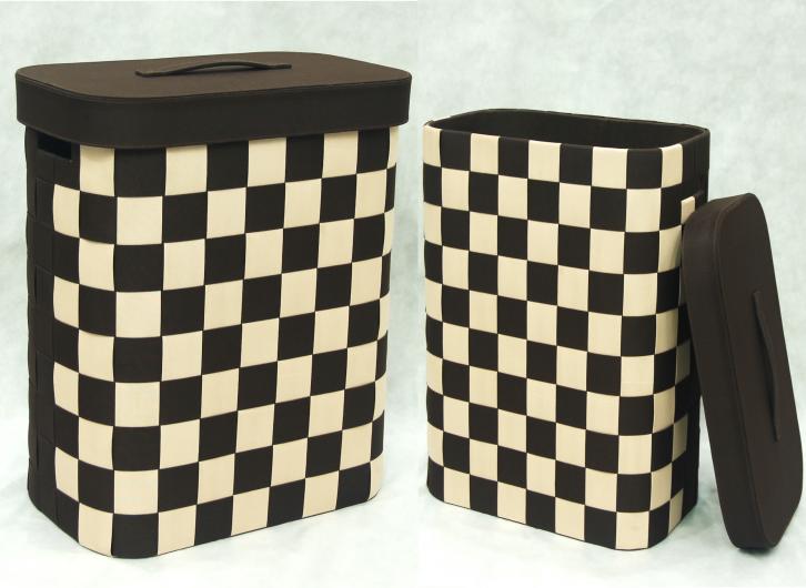 SET OF 2 RECTANGULAR HAMPER SET W/BROWN & BEIGE MAT CHECKERED WEAVE FAUX LEATHER